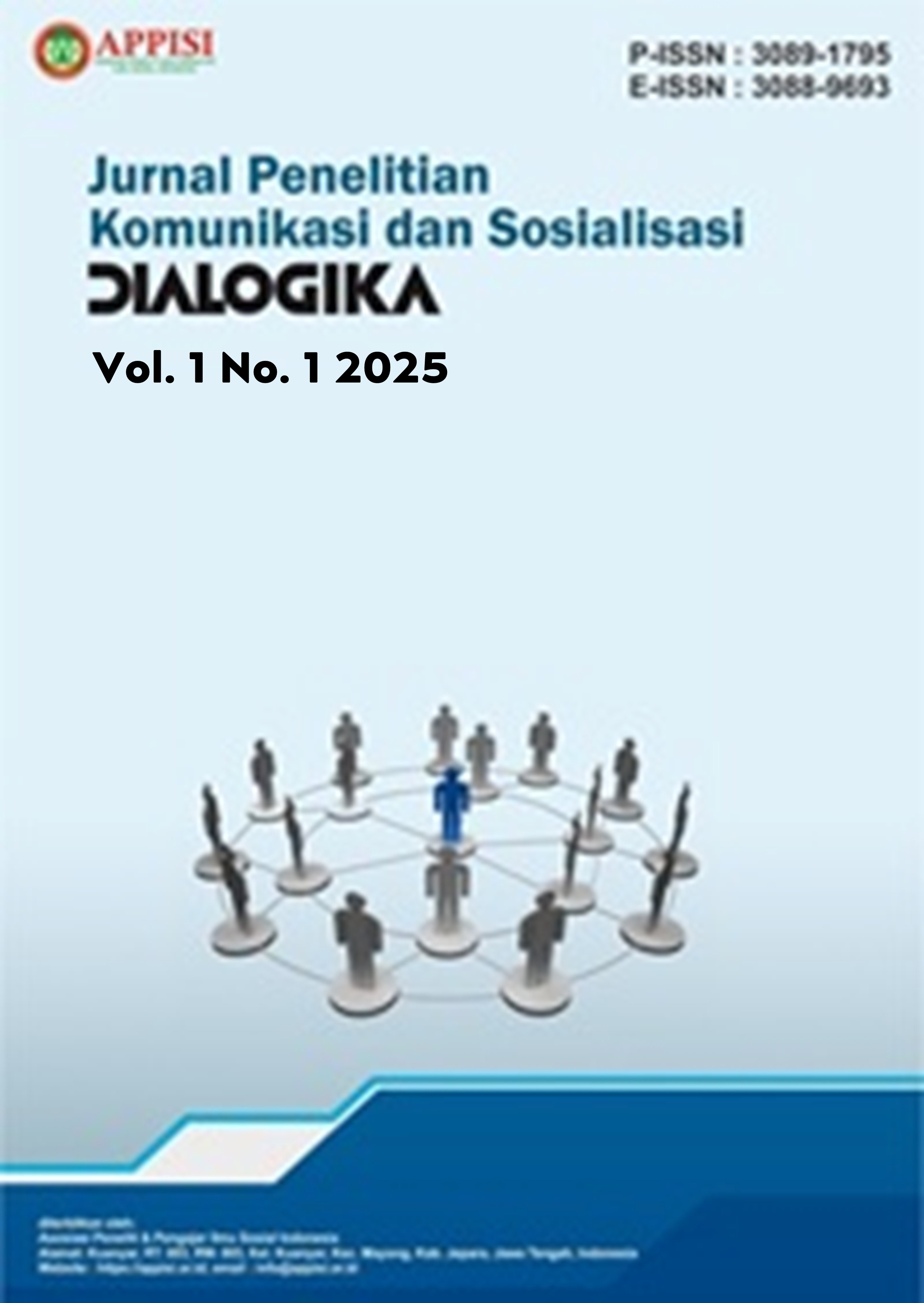 Vol. 2 No. 1 (2026)Dialogika: Jurnal Penelitian Komunikasi dan Sosialisasi adalah jurnal akademik yang diterbitkan oleh Asosiasi Peneliti Dan Pengajar Ilmu Sosial Indonesia. Jurnal ini merupakan publikasi ilmiah yang bertujuan untuk menyebarkan penelitian dan kajian dalam bidang Ilmu Komunikasi, Media, Digitalisasi, dan Teknologi Informasi. Setiap naskah yang dikirimkan akan ditinjau oleh para reviewer. Proses peninjauan menggunakan sistem double-blind review, yaitu reviewer tidak mengetahui identitas penulis, dan penulis tidak mengetahui identitas reviewer. Jurnal ini diterbitkan 3 kali dalam setahun (Februari, Mei, Agustus, dan November).